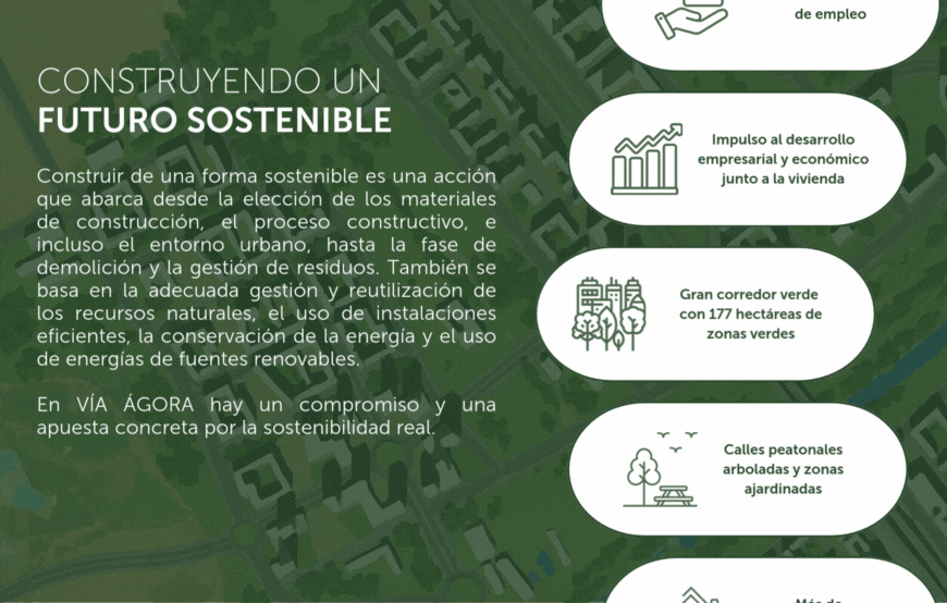 El barrio contará además con más de 25 hectáreas adicionales de zonas verdes propias, más de 252.000 m² de espacios libres, parques urbanos de proximidad y áreas de juego infantil. Todo ello conecta directamente con el Anillo Verde de Sevilla, una gran red de parques que une naturaleza y ciudad en un entorno saludable y lleno de vida.